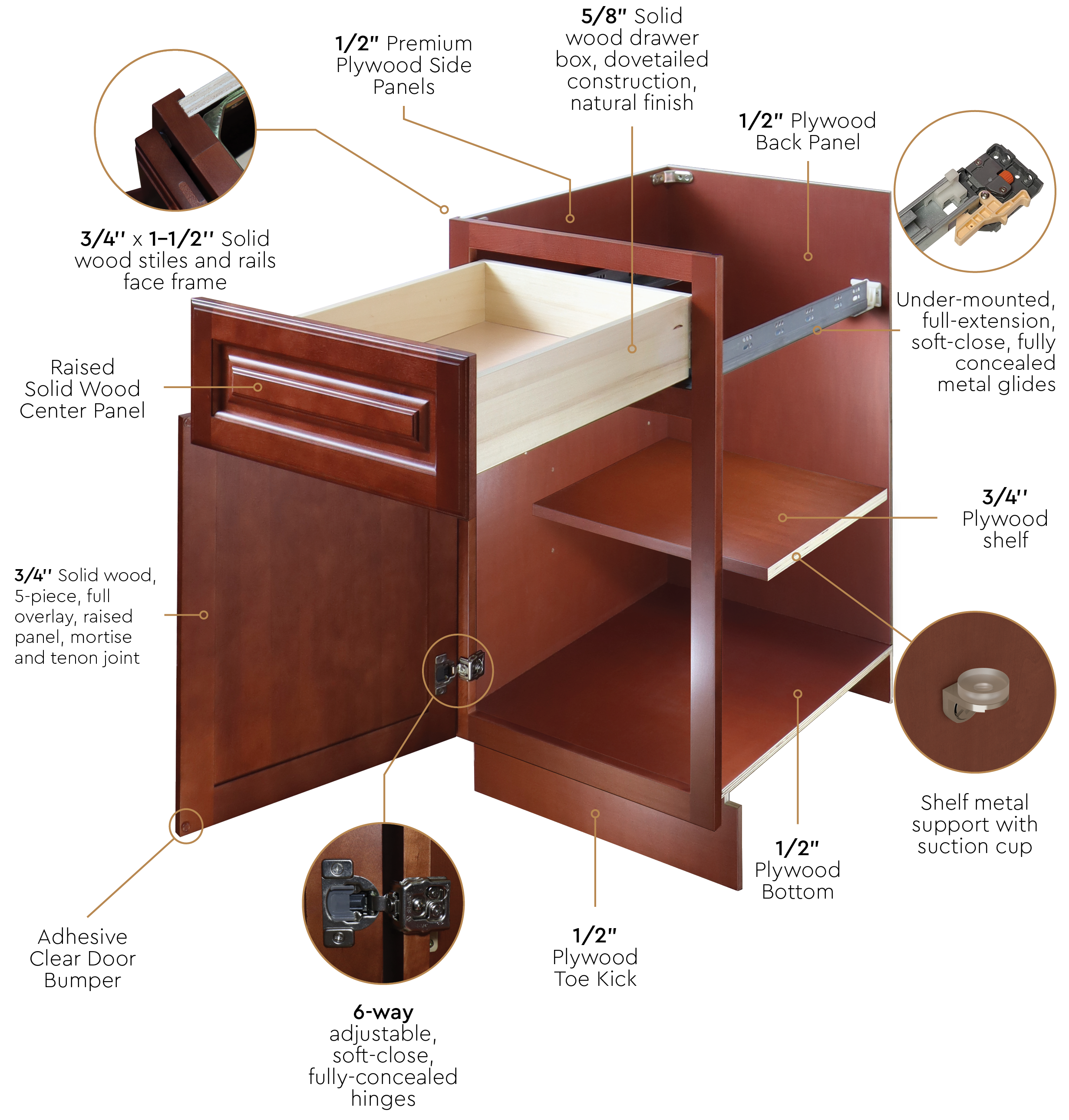 3/4’’ solid birch wood, 5-piece, full-overlay, recessed panel, mortise and tenon joint