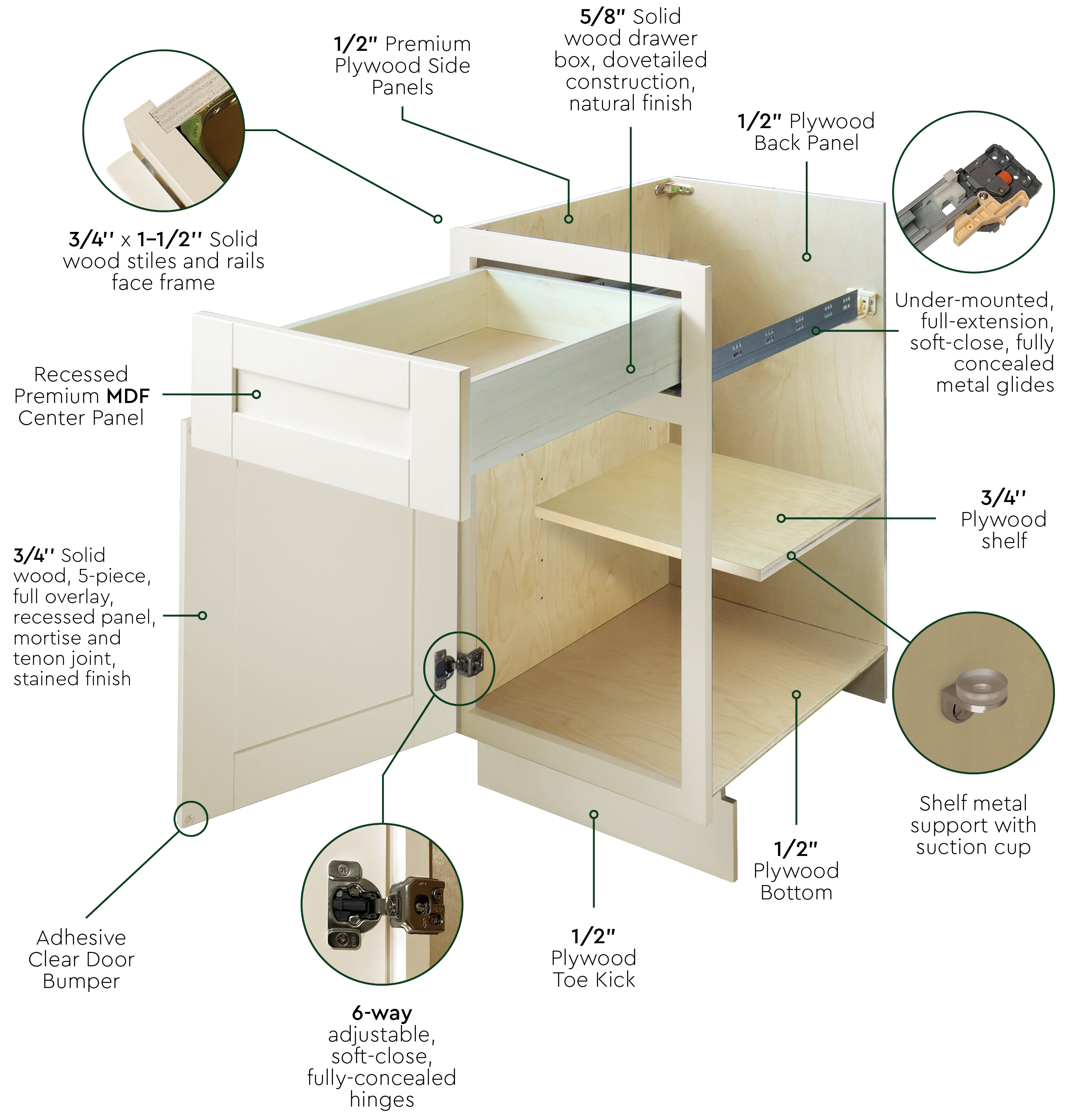 5/8” Solid wood drawer box, dovetailed construction, natural finish
