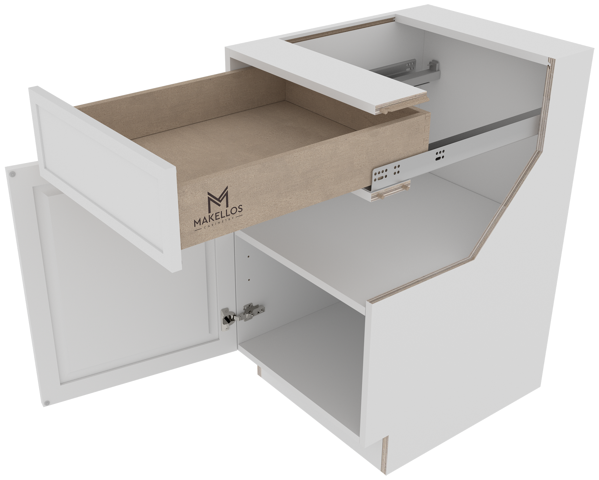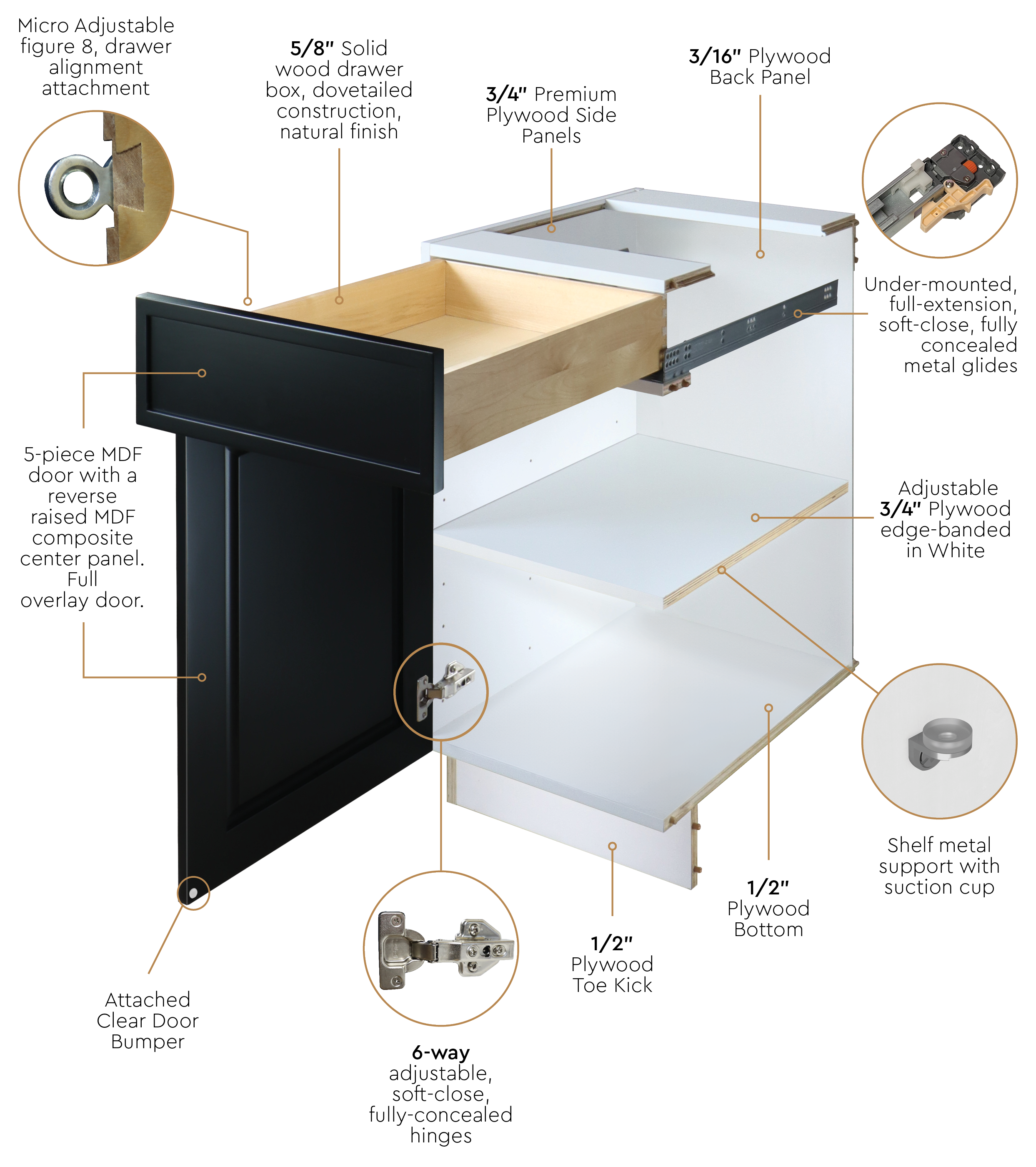 5/8” Solid wood drawer box, dovetailed construction with Micro Adjustable figure 8, drawer alignment attachment.