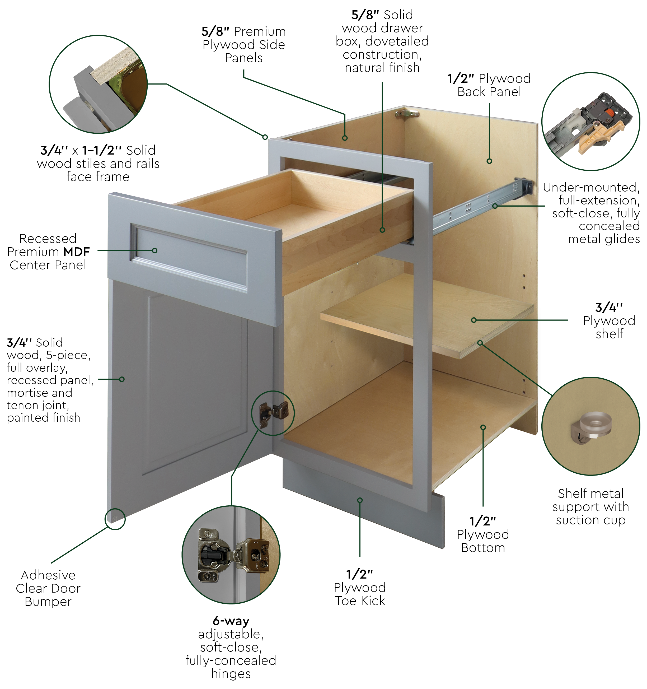 5/8” Solid wood drawer box, dovetailed construction, natural finish